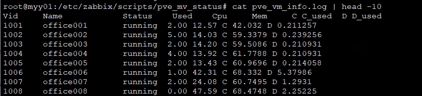 | root@myy01:/etc/zabbix/scripts/pve_mv_status# cat vm_used.sh #!/bin/bash . /etc/profile Os_used_logfile='/etc/zabbix/scripts/pve_mv_status/vm_used.log' Os_status_logfile='/etc/zabbix/scripts/pve_mv_status/vm_status.log' Vm_info_logfile='/etc/zabbix/scripts/pve_mv_status/pve_vm_info.log' Datas=`qm list | awk '{print1"\\t"2"\t"3}' \| awk '{if(1>1000)print}'` echo "{Datas}"\>{Os_status_logfile} Vids=`echo "{Datas}" \| awk 'NR\>1{print1}'` echo -n "">{Os_used_logfile} for i in \`echo "{Vids}"` do Cpu_used=`qm guest exec {i} --timeout 30 wmic cpu get loadpercentage \| grep 'out-data" :' \| grep -o "\[\[:digit:\]\]\*" \| awk '{printf "%.2f\\n",1}'` if [ "{Cpu_used}a" = "a" \];then Cpu_used='0' fi Mem_used=\`qm guest exec {i} --timeout 30 wmic OS get FreePhysicalMemory, TotalVisibleMemorySize /format:list | grep 'out-data" :' | grep -o "[[:digit:]]*" | xargs echo | awk '{printf "%.2f\n",(1-1/2)*100}'` if [ "{Mem_used}a" = "a" \];then Mem_used='0' fi Disk_used=\`qm guest exec {i} --timeout 30 wmic logicaldisk get size,freespace,caption | grep 'out-data" :' | grep -o "[[:digit:]]*" | xargs echo | awk '{print "C "(1-1/2)*100" D "(1-3/4)*100}'` echo "{i} {Cpu_used} {Mem_used} {Disk_used}">>{Os_used_logfile} done printf "%-8s%-16s%-10s%-8s%-8s%-8s%-2s%-8s%-2s%-8s\\n" Vid Name Status Used Cpu Mem C C_used D D_used \>{Vm_info_logfile} for i in `echo "{Vids}"\` do Os_used_data=\`cat {Os_used_logfile} | grep "^{i}" \| awk '{1=""; print}'` Os_status_data=`cat {Os_status_logfile} \| grep "\^{i}"` echo "{Os_status_data} {Os_used_data}">>${Vm_info_logfile} done root@myy01:/etc/zabbix/scripts/pve_mv_status# |