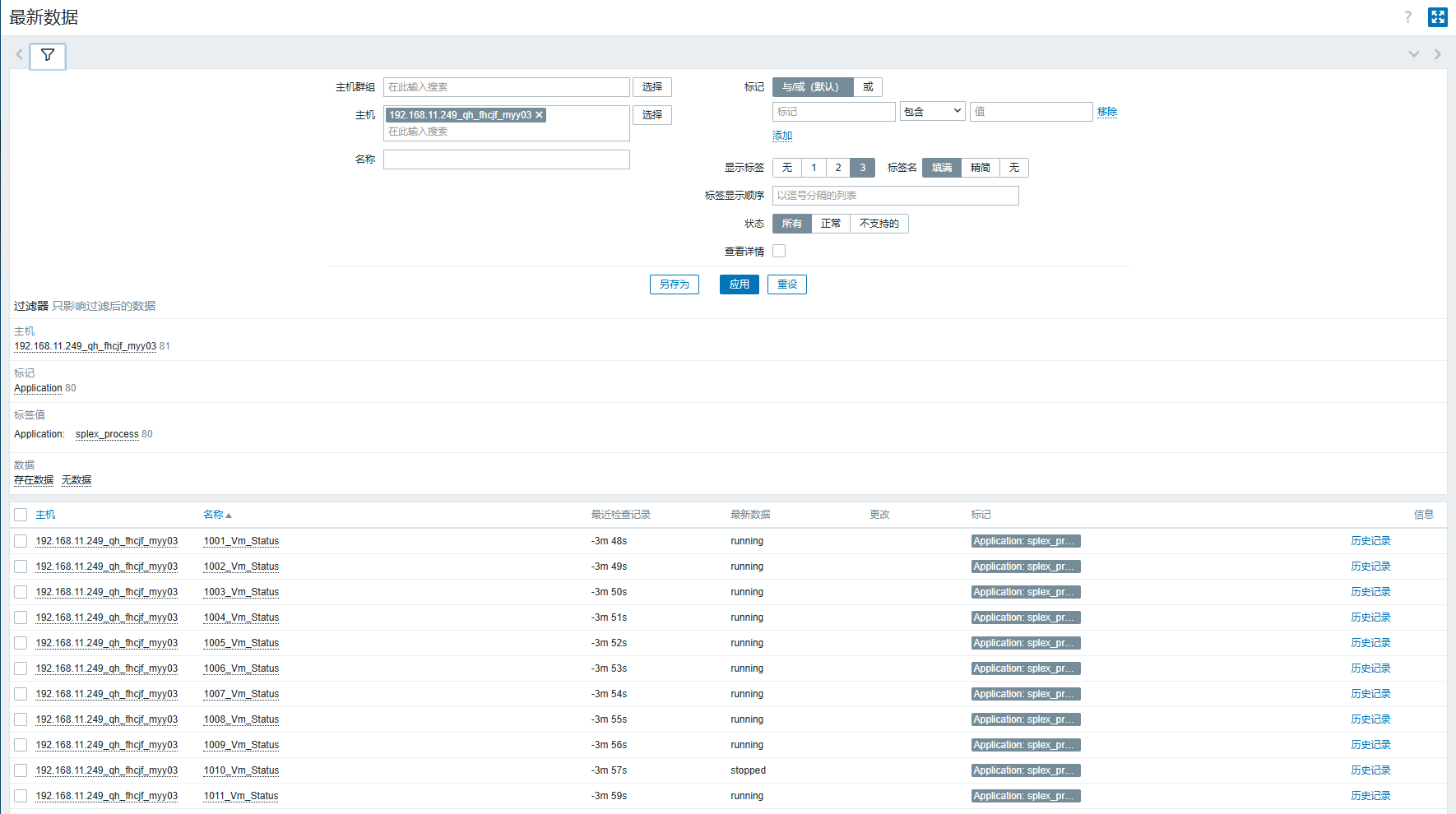 | root@myy01:/etc/zabbix/scripts/pve_mv_status# cat pve_status_discovery.sh #!/bin/bash SPLEXPORT2=\`cat /etc/zabbix/scripts/pve_mv_status/pve_vm_info.log \| awk '{print 1}' | awk 'NR > 1{print}' | wc -l` if [ {SPLEXPORT2} -ne 0 \];then SPLEXPORT=\`cat /etc/zabbix/scripts/pve_mv_status/pve_vm_info.log \| awk '{print 1}' | awk 'NR > 1{print}'` COUNT=`echo "{SPLEXPORT}" \| wc -l\` INDEX=0 echo '{"data":\[' echo "{SPLEXPORT}" | while read LINE; do echo -n '{"{#SPLEXPORT}":"'{LINE}'"}' INDEX=\`expr {INDEX} + 1` if [ {INDEX} -lt {COUNT} ];then echo "," fi done echo ']}' fi |