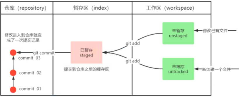 Git工作目录下对于文件的修改(增加、删除、更新)会存在几个状态,这些修改的状态会随着我们执行Git的命令而发生变化。