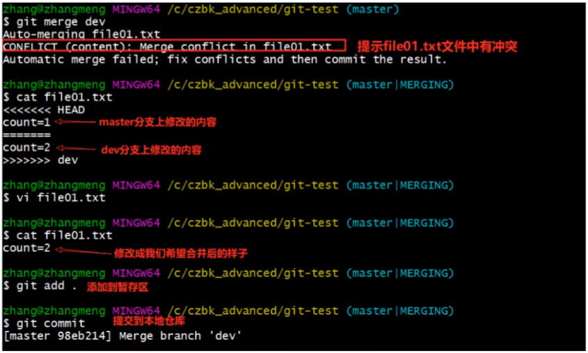 当两个分支上对文件的修改可能会存在冲突,例如同时修改了同一个文件的同一行,这时就需要手动解决冲突,解决冲突步骤如下: