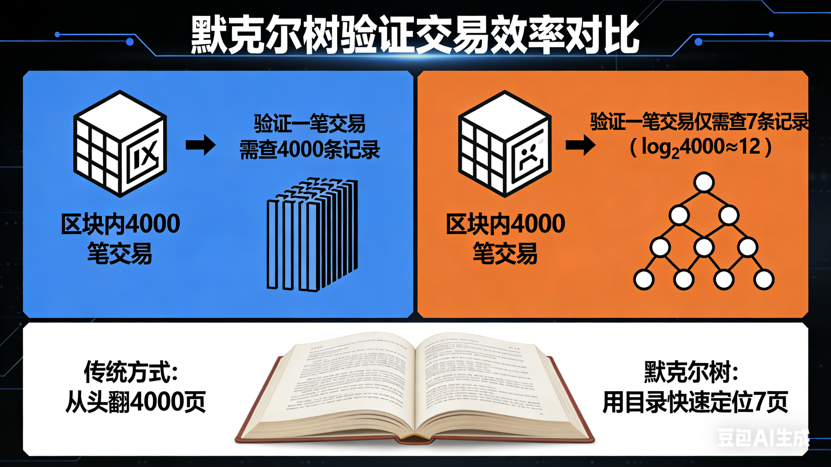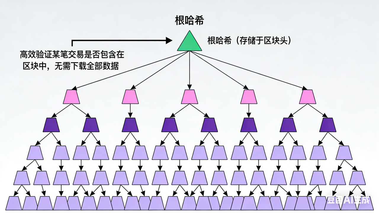 默克尔树 : 将大量交易数据分层哈希压缩成一个"根哈希",存储在区块头中。用于高效验证某笔交易是否包含在区块中,无需下载全部数据。