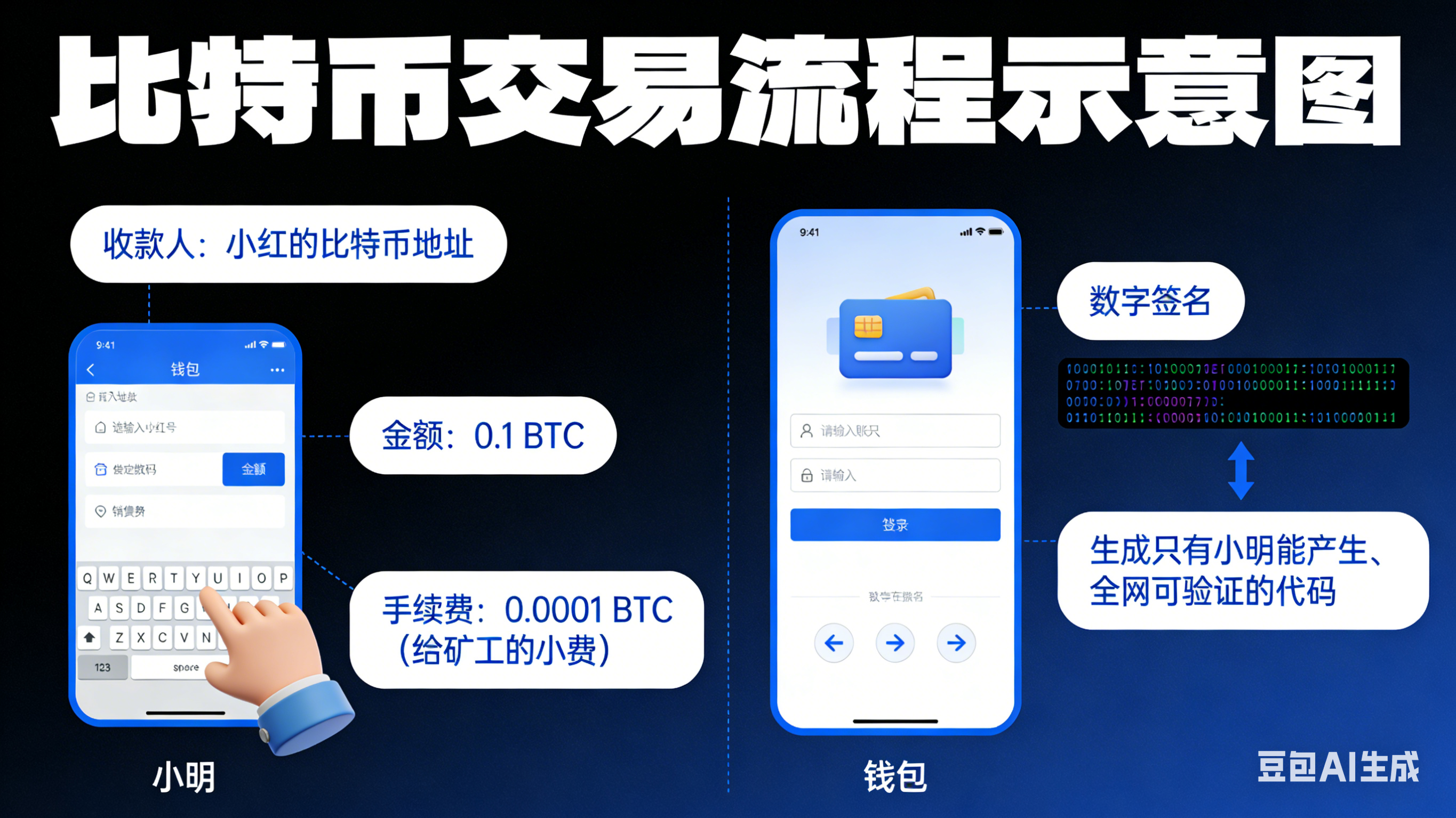 签名的交易被广播到比特币网络 → 进入"内存池"(待处理交易池)→ 全球节点验证签名是否有效、余额是否足够
