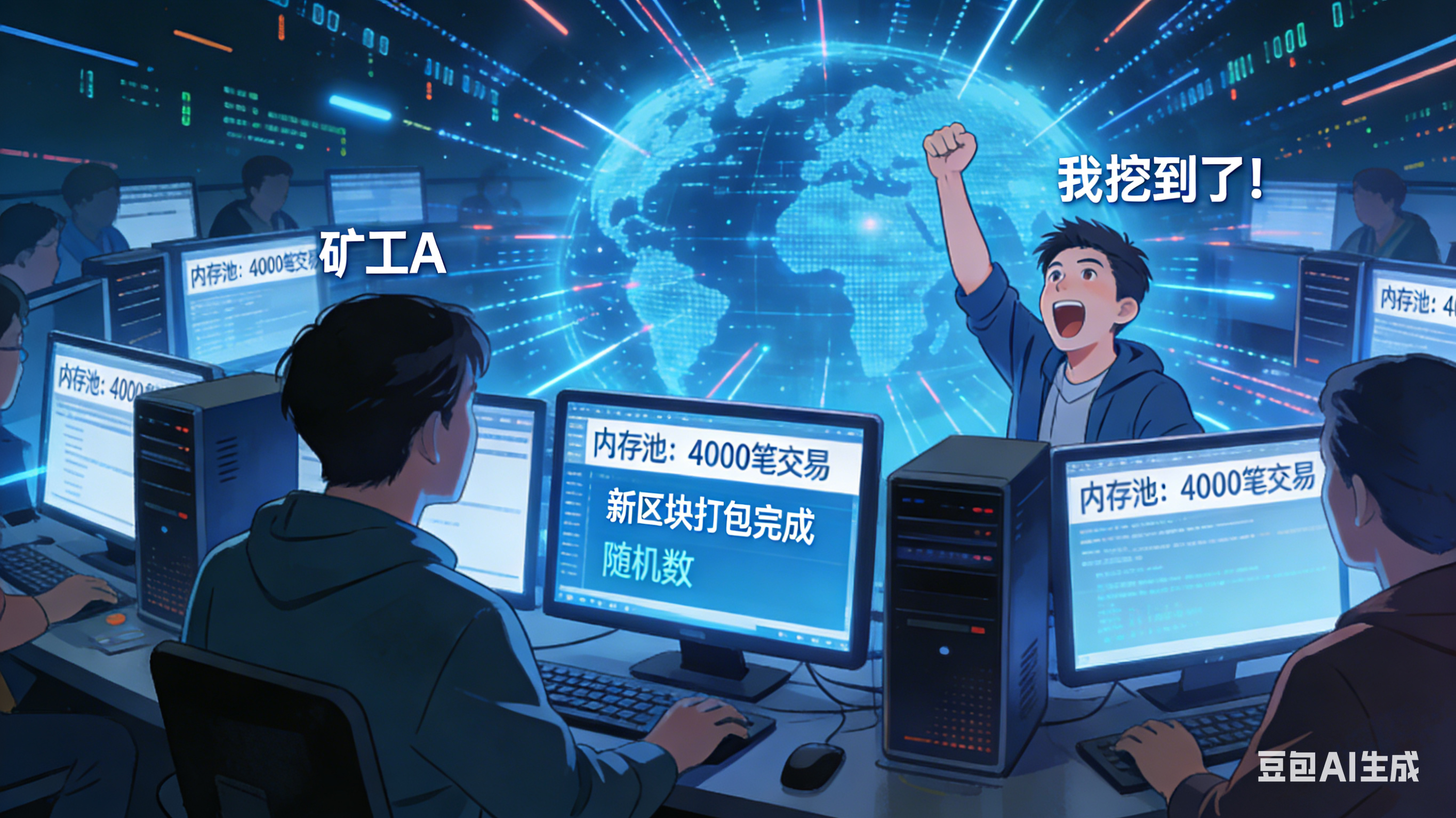 全球矿工开始新一轮数学竞赛。目标:把内存池里约4000笔交易打包成一个区块并找到那个神奇的随机数,矿工A率先找到解 → 兴奋大喊:"我挖到了!" → 立即广播自己打包的新区块给全网