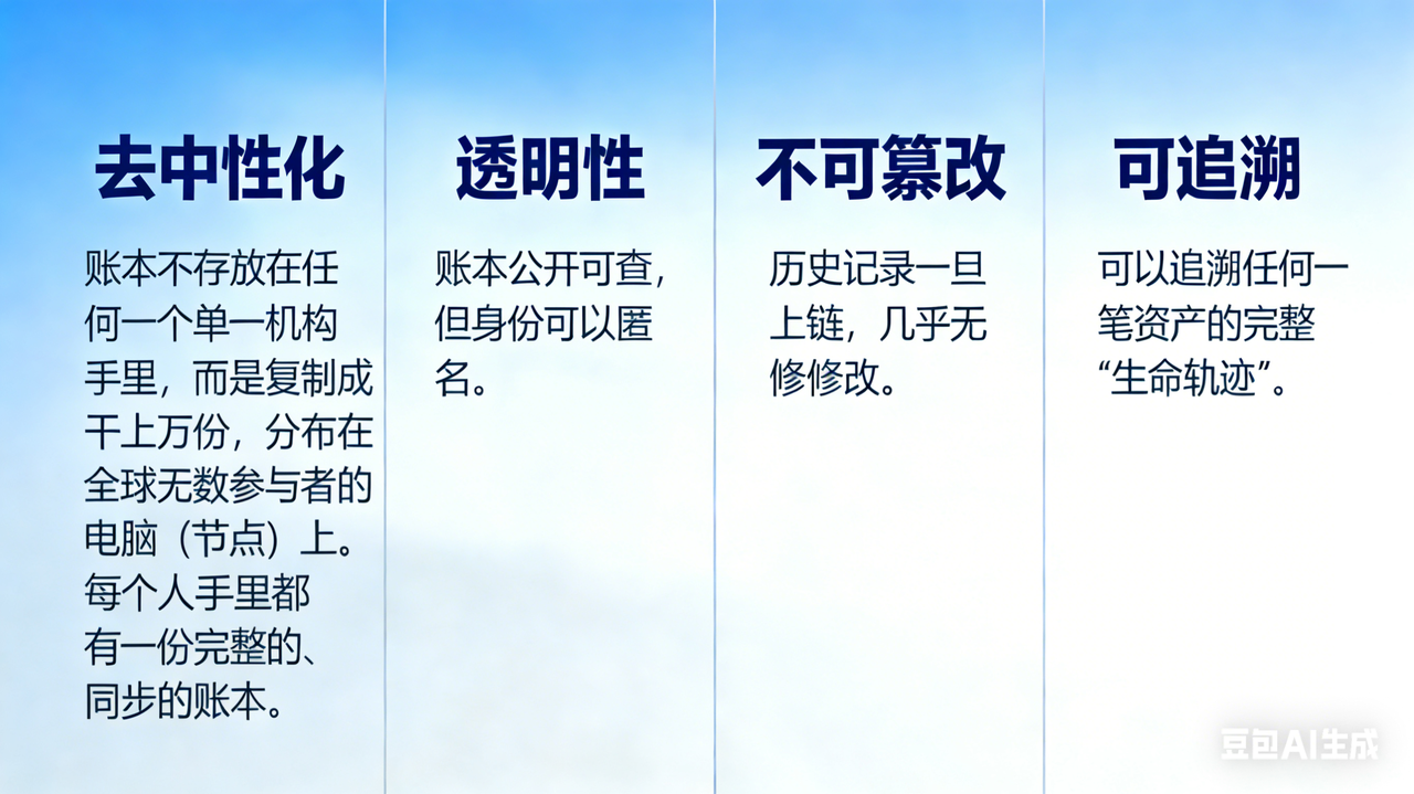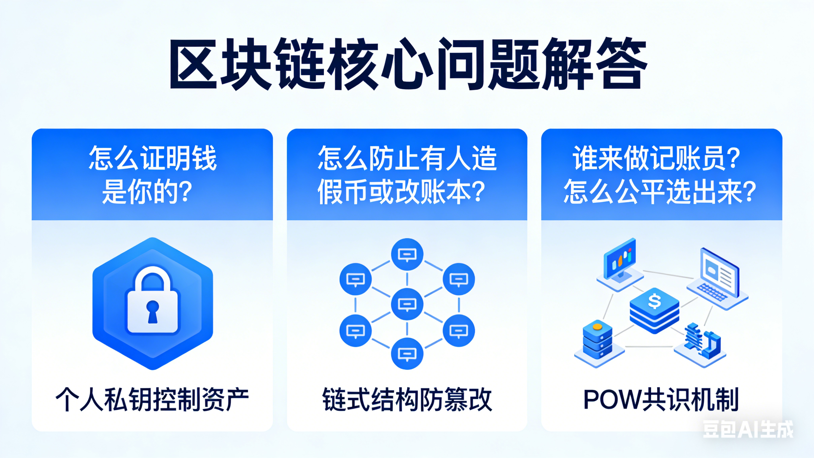 - 区块链结构:每个区块包含前一个区块的哈希值,形成"链",确保数据不可篡改。