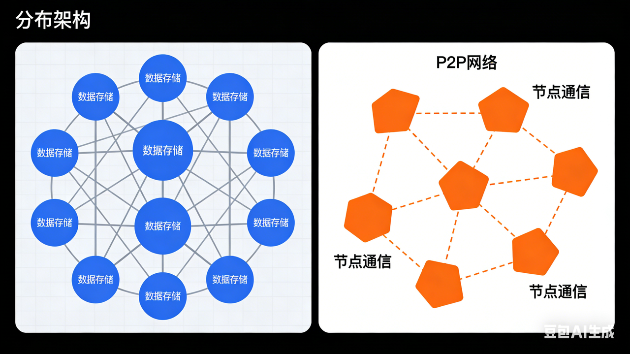 - 作用 :区块链的物理基础。所有节点平等互联,共同维护网络,没有中心服务器。数据通过点对点的方式传播和验证,确保系统的去中心化 和抗 单点故障能力。