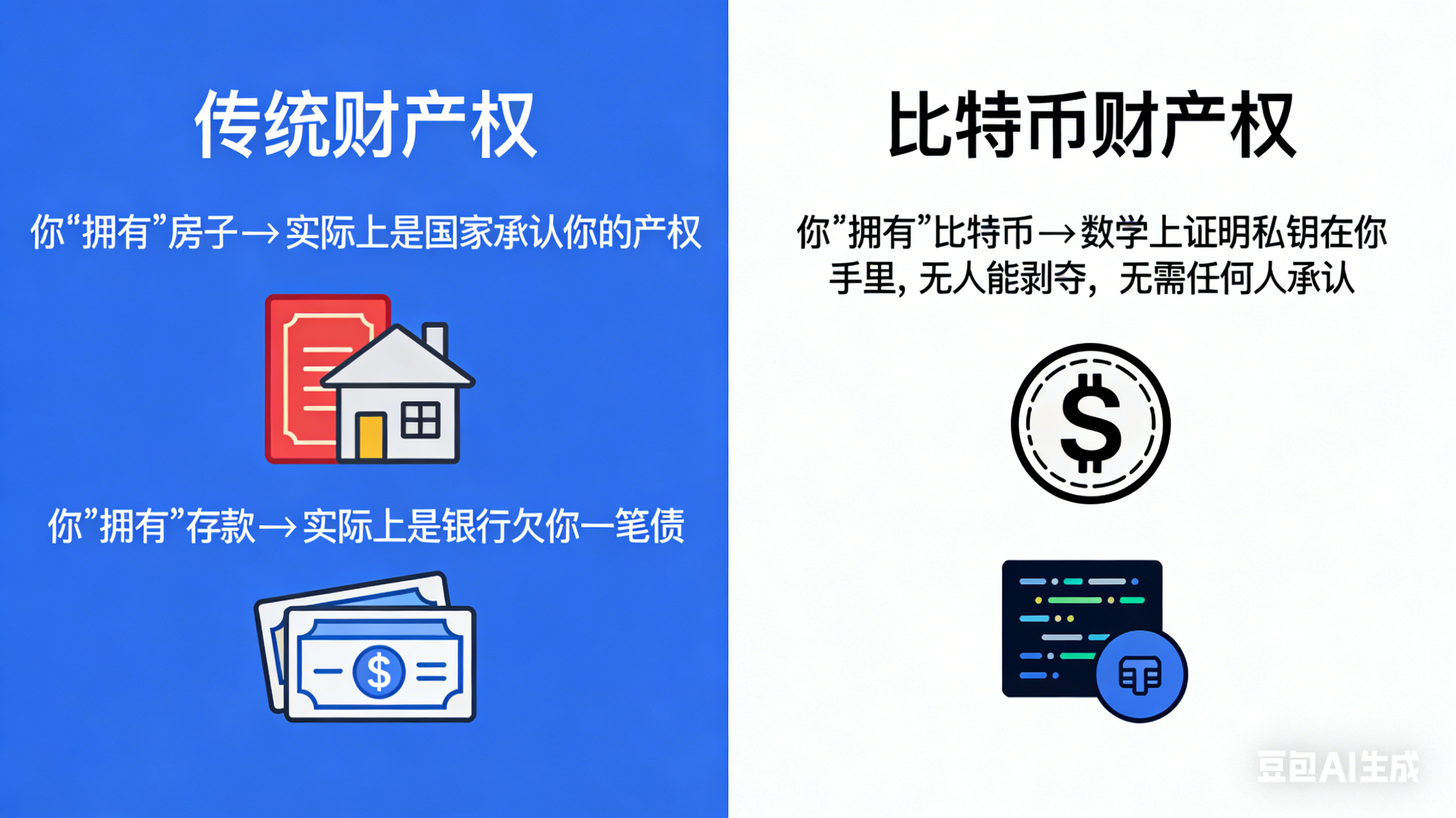 传统财产权,你"拥有"房子 → 实际上是国家承认你的产权。你"拥有"存款 → 实际上是银行欠你一笔债。 比特币财产权,你"拥有"比特币 → 数学上证明私钥在你手里无人能剥夺,无需任何人承认。