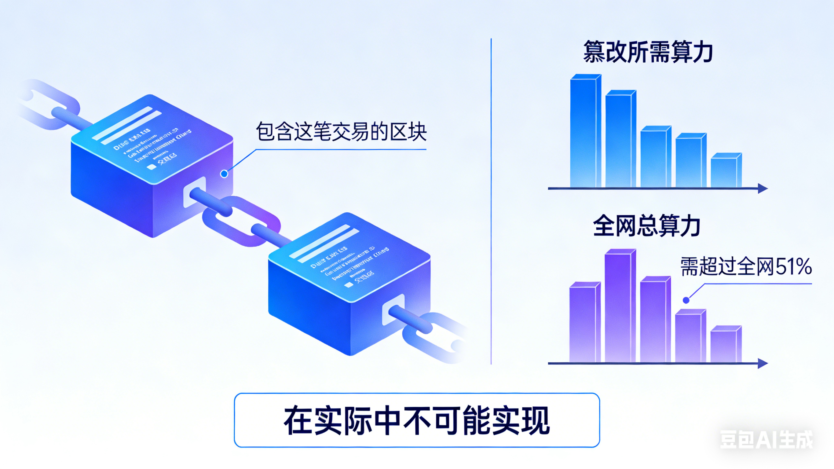 小红看到:1个确认(刚刚打包) 10分钟后:2个确认(后面又加了一个区块) 1小时后:6个确认(行业标准,几乎不可逆) 此时,如果有人想篡改这笔交易。需要从包含这笔交易的区块开始重写,并且算力超过全网51% → 在实际中不可能实现