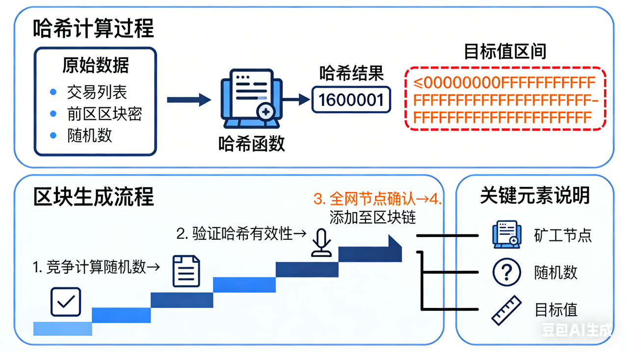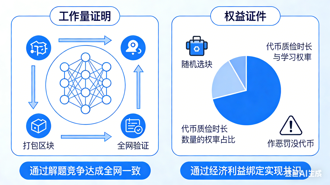 - 原理:节点通过计算竞争解决一个数学难题(挖矿),消耗算力获得记账权。优点:高度安全;缺点:耗能高、吞吐量低。