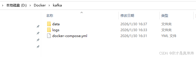 本地创建:D:\Docker\kafka下建立 data,logs,docker-compose.yml