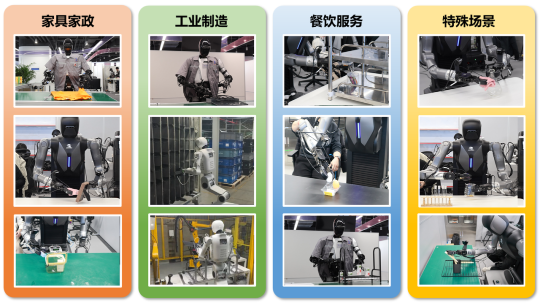 在任务构建 方法上,白虎-VTouch 并未沿用传统的"人工定义单任务"路径,而是提出"矩阵式"任务构建新范式 。该范式以双臂协同结构、原子操作类型、接触与触觉模式作为核心维度,并结合物体与几何属性、感知模态组合及任务层级结构等辅助维度进行系统性交叉,每一个维度交点,均对应一个可执行的最小任务单元。基于这一构建逻辑,白虎-VTouch 覆盖了家居家政、工业制造、餐饮服务与特殊作业四大真实应用领域,形成380+ 任务类型、100+ 原子技能、500+ 真实物品的高密度任务空间。同时,通过光照变化、遮挡干扰与姿态扰动等方式显式引入泛化条件,使任务设计从一开始即面向真实部署环境。