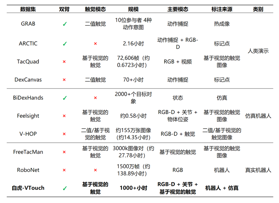 白虎-VTouch 所明显不同的地方在于,它首次将高分辨率视触觉信息、真实物理接触过程以及跨机器人本体的一致标注体系放在同一个数据框架中进行系统性构建。这类数据本身具有极强的工程成本属性:高带宽同步采集、复杂标定流程、多机器人平台协同、真实场景反复复现,几乎不具备被单一团队长期独占和闭源演进的可持续性。正因如此,我们认为,这类数据如果不能进入开源生态,其价值会被极大限制。