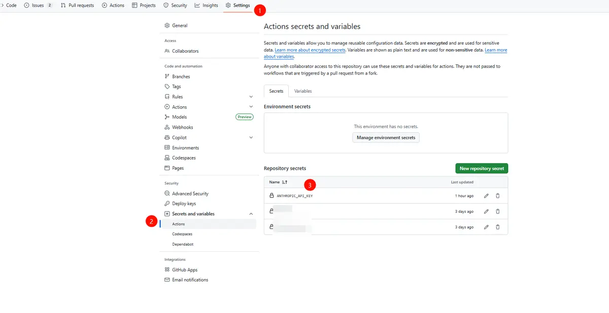 之后在 Github 上对应仓库的 Settings -> Secrets and Variables -> New repository secret 配置密钥信息,避免 ANTHROPIC_API_KEY 暴露在 workflow 文件里。