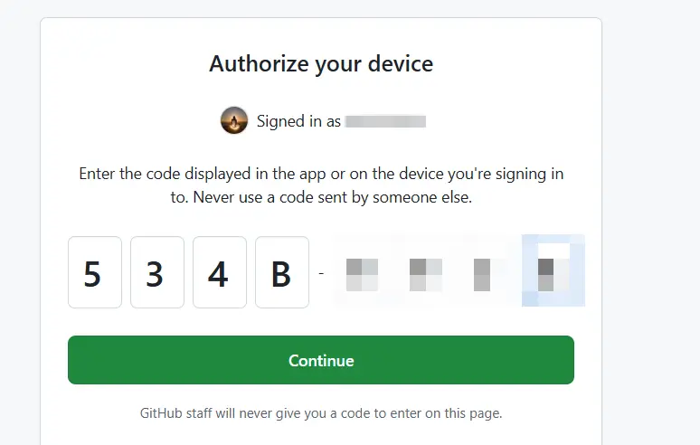 在登录时输入认证码,认证完成后可以执行 gh auth status 确认当前登录状态: