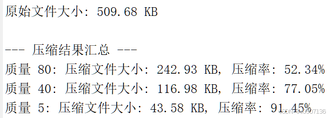 fprintf('质量 %d: 压缩文件大小: %.2f KB, 压缩率: %.2f%%\n', ...