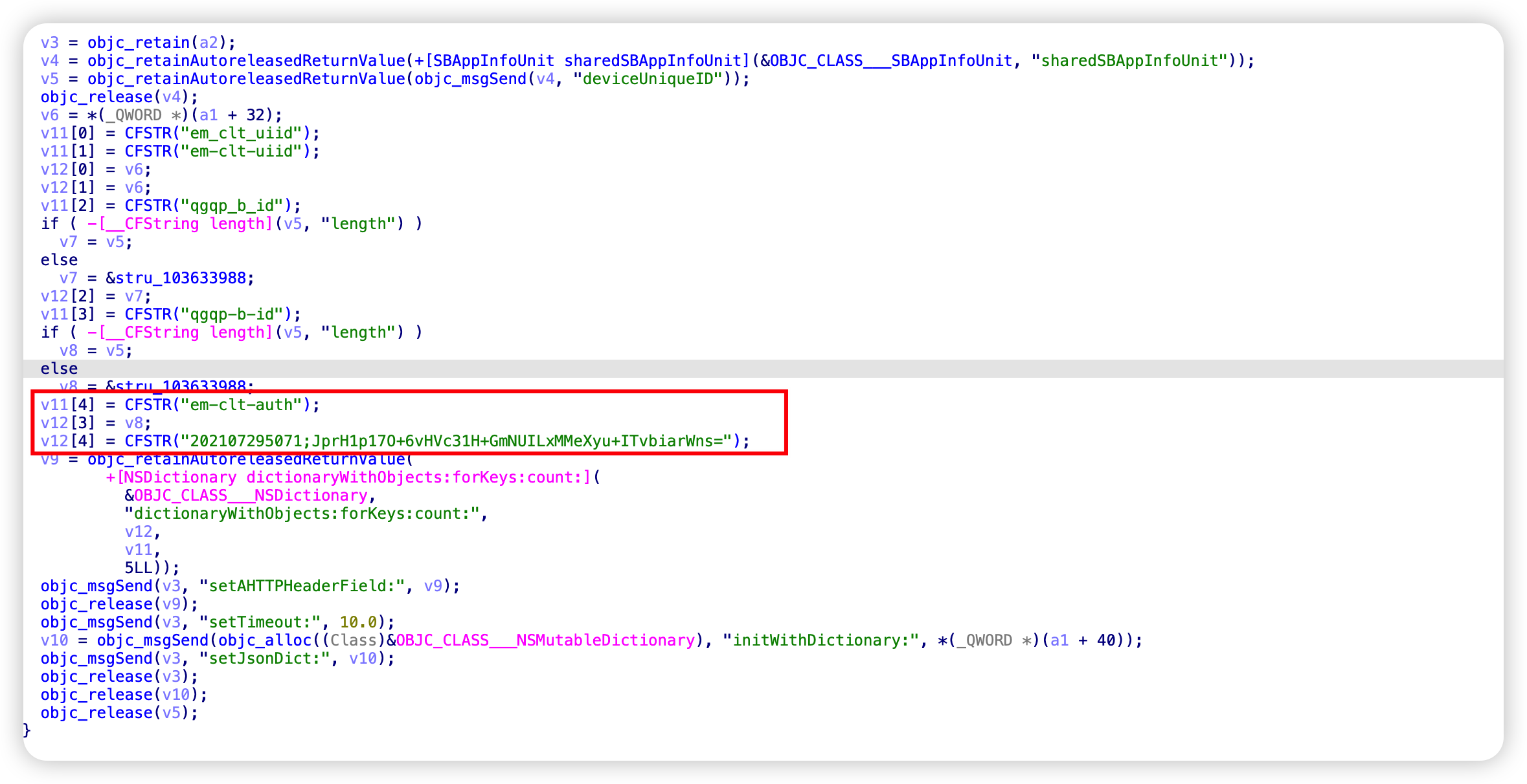 在 sub_100358960 函数中,系统为 SBHttpTask 设置了一系列关键 Headers: