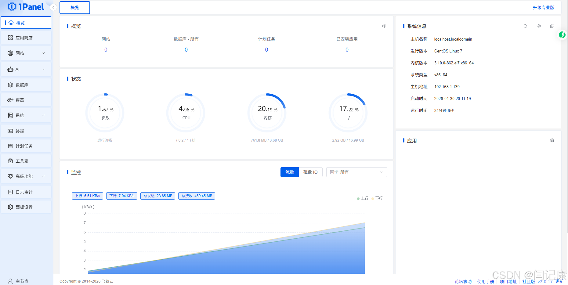 1panel是一个web端linux的运维工具,可以帮助我们更好的管理linux服务器,而且他还具备管理ai的功能,那么我们今天来安装一下,我们今天以centos7系统为例。官网:1Panel - 现代化、开源的Linux服务器运维管理面板