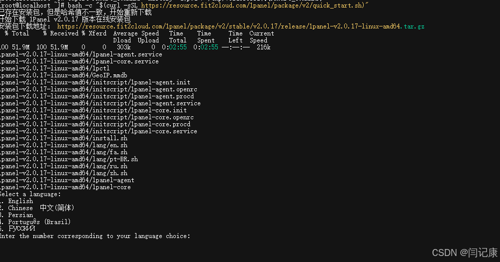 以root用户身份运行一键安装脚本,自动完成1Panel的下载和安装。