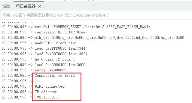 将代码中的 ssid 和 password 修改为目标 Wi-Fi 网络的名称和密码后上传。串口监视器将显示连接过程和获取到的 IP 地址。在同一局域网的设备上打开浏览器,输入显示的 IP 地址,即可看到"Hello World!"页面。