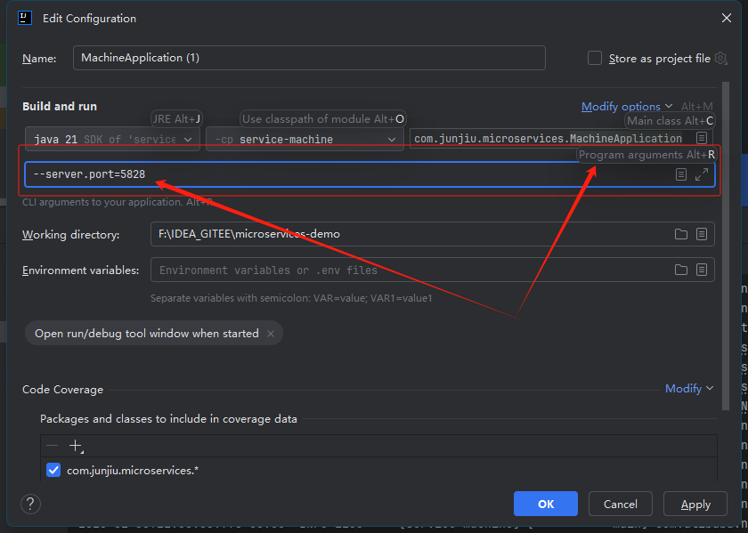 Program arguments文本框填写如下,新增服务端口:--server.port=5828