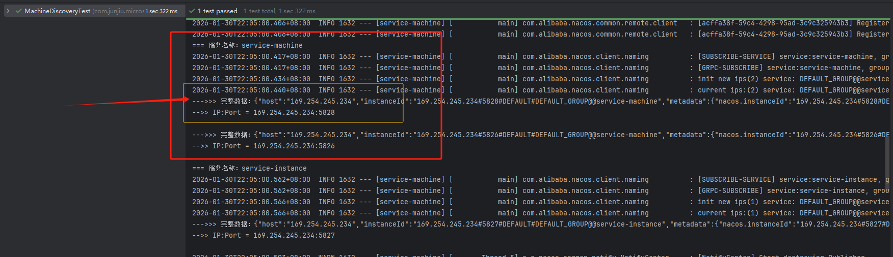 2026-01-30T21:56:59.518+08:00 INFO 2544 --- [service-machine] [ main] com.alibaba.nacos.client.naming : current ips:(1) service: DEFAULT_GROUP@@service-instance -> [{"instanceId":"169.254.245.234#5827#DEFAULT#DEFAULT_GROUP@@service-instance","ip":"169.254.245.234","port":5827,"weight":1.0,"healthy":true,"enabled":true,"ephemeral":true,"clusterName":"DEFAULT","serviceName":"DEFAULT_GROUP@@service-instance","metadata":{"preserved.register.source":"SPRING_CLOUD","IPv6":"[2408:820c:8f1e:5650:54e7:c2f:4f57:3182]"},"ipDeleteTimeout":30000,"instanceHeartBeatInterval":5000,"instanceHeartBeatTimeOut":15000}]