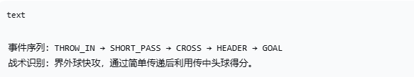 1.直接关联:通过`related_event_id`等字段,直接链接因果事件。例如,一次`ASSIST`传球事件会明确指向它所导致的那个`GOAL`射门事件。