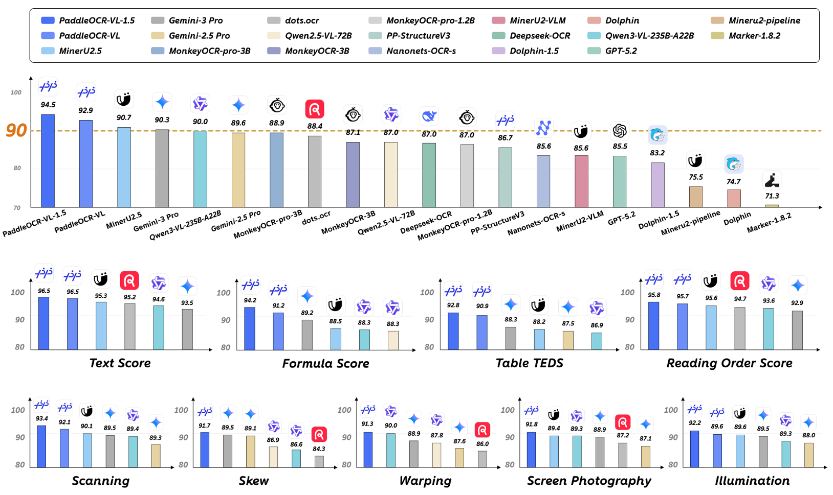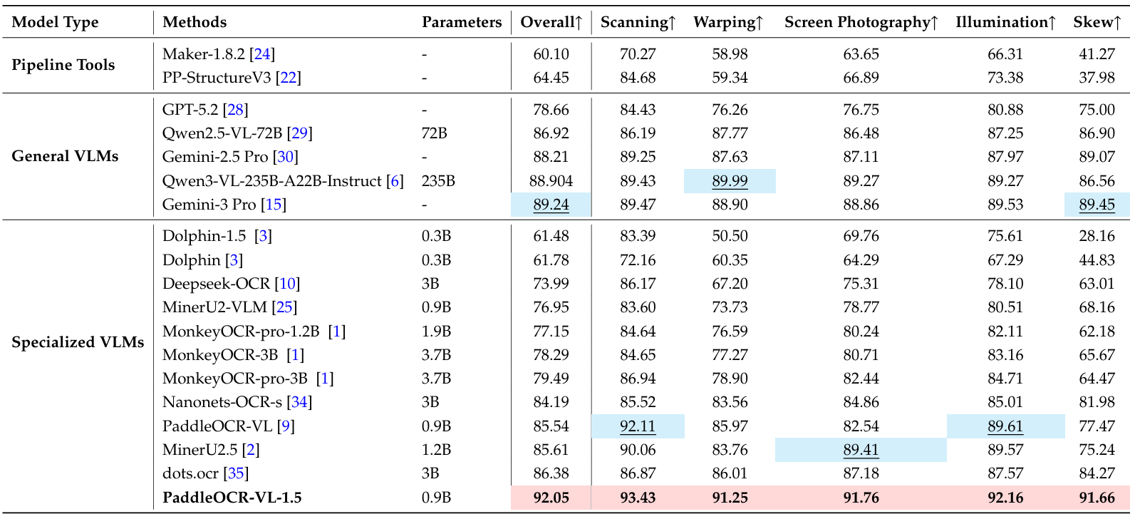 为了弥补这一差距,我们推出了PaddleOCR-VL-1.5,这是一个高性能、资源高效的文档解析解决方案,显著提升了通用精度和真实世界的鲁棒性。基于经过验证的0.9B超紧凑架构,PaddleOCR-VL-1.5引入了几个关键的改进: