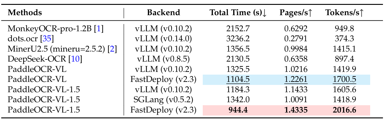 表6总结了在OmniDocBench v1.5数据集上不同OCR方法在不同部署后端下的端到端推理效率。PaddleOCR-VL-1.5在所有指标上均实现了最佳整体性能。使用FastDeploy后端,它在单个NVIDIA A100 GPU上达到了1.4335页/秒和2016.6令牌/秒,分别超过了其前身PaddleOCR-VL 16.9%和18.6%。这些结果证实了PaddleOCR-VL-1.5提供了SOTA的推理速度和吞吐量,使其非常适合大规模、真实世界的文档理解应用。