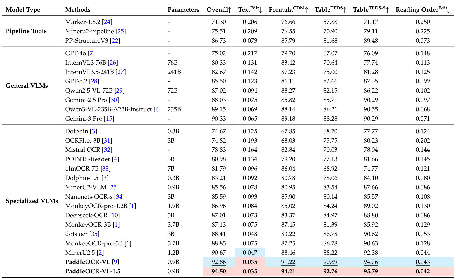 1\] Zhang Li, Yuliang Liu, Qiang Liu, Zhiyin Ma, Ziyang Zhang, Shuo Zhang, Zidun Guo, Jiarui Zhang, Xinyu Wang, and Xiang Bai. Monkeyocr: Document parsing with a structure-recognition-relation triplet paradigm. arXiv preprint arXiv:2506.05218, 2025. \[2\] Junbo Niu, Zheng Liu, Zhuangcheng Gu, Bin Wang, Linke Ouyang, Zhiyuan Zhao, Tao Chu, Tianyao He, Fan Wu, Qintong Zhang, et al. Mineru2. 5: A decoupled vision-language model for efficient high-resolution document parsing. arXiv preprint arXiv:2509.22186, 2025. \[3\] Hao Feng, Shu Wei, Xiang Fei, Wei Shi, Yingdong Han, Lei Liao, Jinghui Lu, Binghong Wu, Qi Liu, Chunhui Lin, et al. Dolphin: Document image parsing via heterogeneous anchor prompting. arXiv preprint arXiv:2505.14059, 2025. \[4\] Yuan Liu, Zhongyin Zhao, Le Tian, Haicheng Wang, Xubing Ye, Yangxiu You, Zilin Yu, Chuhan Wu, Xiao Zhou, Yang Yu, et al. Points-reader: Distillation-free adaptation of vision-language models for document conversion. arXiv preprint arXiv:2509.01215, 2025. \[5\] Baidu-ERNIE-Team. Ernie 4.5 technical report, 2025. \[6\] An Yang, Anfeng Li, Baosong Yang, Beichen Zhang, Binyuan Hui, Bo Zheng, Bowen Yu, Chang Gao, Chengen Huang, Chenxu Lv, et al. Qwen3 technical report. arXiv preprint arXiv:2505.09388, 2025. \[7\] Josh Achiam, Steven Adler, Sandhini Agarwal, Lama Ahmad, Ilge Akkaya, Florencia Leoni Aleman, Diogo Almeida, Janko Altenschmidt, Sam Altman, Shyamal Anadkat, et al. Gpt-4 technical report. arXiv preprint arXiv:2303.08774, 2023. \[8\] Patrick Lewis, Ethan Perez, Aleksandra Piktus, Fabio Petroni, Vladimir Karpukhin, Naman Goyal, Heinrich Küttler, Mike Lewis, Wen-tau Yih, Tim Rocktäschel, et al. Retrieval-augmented generation for knowledge-intensive nlp tasks. Advances in neural information processing systems, 33:9459--9474, 2020. \[9\] Cheng Cui, Ting Sun, Suyin Liang, Tingquan Gao, Zelun Zhang, Jiaxuan Liu, Xueqing Wang, Changda Zhou, Hongen Liu, Manhui Lin, et al. Paddleocr-vl: Boosting multilingual document parsing via a 0.9 b ultra-compact vision-language model. arXiv preprint arXiv:2510.14528, 2025. \[10\] Haoran Wei, Yaofeng Sun, and Yukun Li. Deepseek-ocr: Contexts optical compression. arXiv preprint arXiv:2510.18234, 2025. \[11\] Jiarui Zhang, Yuliang Liu, Zijun Wu, Guosheng Pang, Zhili Ye, Yupei Zhong, Junteng Ma, Tao Wei, Haiyang Xu, Weikai Chen, et al. Monkeyocr v1.5 technical report: Unlocking robust document parsing for complex patterns. arXiv preprint arXiv:2511.10390, 2025. \[12\] Hunyuan Vision Team, Pengyuan Lyu, Xingyu Wan, Gengluo Li, Shangpin Peng, Weinong Wang, Liang Wu, Huawen Shen, Yu Zhou, Canhui Tang, et al. Hunyuanocr technical report. arXiv preprint arXiv:2511.19575, 2025. \[13\] Ting Sun, Cheng Cui, Yuning Du, and Yi Liu. Pp-doclayout: A unified document layout detection model to accelerate large-scale data construction. arXiv preprint arXiv:2503.17213, 2025. \[14\] Linke Ouyang, Yuan Qu, Hongbin Zhou, Jiawei Zhu, Rui Zhang, Qunshu Lin, Bin Wang, Zhiyuan Zhao, Man Jiang, Xiaomeng Zhao, et al. Omnidocbench: Benchmarking diverse pdf document parsing with comprehensive annotations. In Proceedings of the Computer Vision and Pattern Recognition Conference, pages 24838--24848, 2025. \[15\] Google DeepMind. Gemini 3.0. https://blog.google/products-and-platforms/products/gemini/gemini-3-collection/, 2025. \[16\] Yian Zhao, Wenyu Lv, Shangliang Xu, Jinman Wei, Guanzhong Wang, Qingqing Dang, Yi Liu, and Jie Chen. Detrs beat yolos on real-time object detection. In Proceedings of the IEEE/CVF conference on computer vision and pattern recognition, pages 16965--16974, 2024. \[17\] Mostafa Dehghani, Basil Mustafa, Josip Djolonga, Jonathan Heek, Matthias Minderer, Mathilde Caron, Andreas Steiner, Joan Puigcerver, Robert Geirhos, Ibrahim M Alabdulmohsin, et al. Patch n'pack: Navit, a vision transformer for any aspect ratio and resolution. Advances in Neural Information Processing Systems, 36:2252--2274, 2023. \[18\] PaddlePaddle Authors. Paddleformers. https://github.com/PaddlePaddle/PaddleFormers, 2025. \[19\] Yanjun Ma, Dianhai Yu, Tian Wu, and Haifeng Wang. Paddlepaddle: An open-source deep learning platform from industrial practice. Frontiers of Data and Computing, 1(1):105--115, 2019. \[20\] Zhihong Shao, Peiyi Wang, Qihao Zhu, Runxin Xu, Junxiao Song, Xiao Bi, Haowei Zhang, Mingchuan Zhang, YK Li, Yang Wu, et al. Deepseekmath: Pushing the limits of mathematical reasoning in open language models. arXiv preprint arXiv:2402.03300, 2024. \[21\] Alec Radford, Jong Wook Kim, Chris Hallacy, Aditya Ramesh, Gabriel Goh, Sandhini Agarwal, Girish Sastry, Amanda Askell, Pamela Mishkin, Jack Clark, et al. Learning transferable visual models from natural language supervision. In International conference on machine learning, pages 8748--8763. PMLR, 2021. \[22\] Cheng Cui, Ting Sun, Manhui Lin, Tingquan Gao, Yubo Zhang, Jiaxuan Liu, Xueqing Wang, Zelun Zhang, Changda Zhou, Hongen Liu, et al. Paddleocr 3.0 technical report. arXiv preprint arXiv:2507.05595, 2025. \[23\] Bin Wang, Fan Wu, Linke Ouyang, Zhuangcheng Gu, Rui Zhang, Renqiu Xia, Botian Shi, Bo Zhang, and Conghui He. Image over text: Transforming formula recognition evaluation with character detection matching. In Proceedings of the IEEE/CVF Conference on Computer Vision and Pattern Recognition (CVPR), pages 19681--19690, June 2025. \[24\] Vik Paruchuri. Marker. https://github.com/datalab-to/marker, 2025. Accessed: 2025-09-25. \[25\] opendatalab. Mineru2.0-2505-0.9b. https://huggingface.co/opendatalab/MinerU2.0-2505-0.9B, 2025. \[26\] Jinguo Zhu, Weiyun Wang, Zhe Chen, Zhaoyang Liu, Shenglong Ye, Lixin Gu, Hao Tian, Yuchen Duan, Weijie Su, Jie Shao, et al. Internvl3: Exploring advanced training and test-time recipes for open-source multimodal models. arXiv preprint arXiv:2504.10479, 2025. \[27\] Weiyun Wang, Zhangwei Gao, Lixin Gu, Hengjun Pu, Long Cui, Xingguang Wei, Zhaoyang Liu, Linglin Jing, Shenglong Ye, Jie Shao, et al. Internvl3.5: Advancing open-source multimodal models in versati