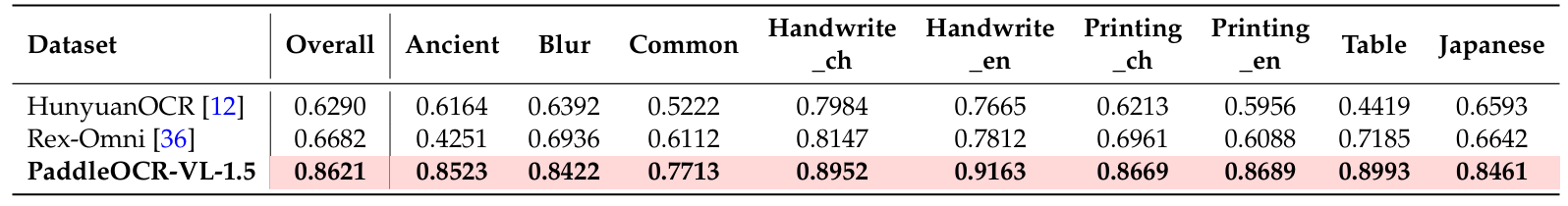 其次,我们扩展了模型的核心能力。在保持高效的NaViT风格动态分辨率编码器和ERNIE-4.5-0.3B [ 5 ] [5] [5]语言主干的同时,我们整合了包括印章识别和文本定位在内的新任务。在文本、表格和公式识别方面的系统优化进一步推动了模型达到了新的性能里程碑。