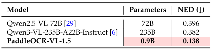 如表5所示,PaddleOCR-VL-1.5在印章识别方面展现出明显优势。尽管其规模紧凑(0.9B参数),它实现了0.138的NED,以较大优势超过了235B参数的Qwen3-VL(0.382)。这突显了模型在处理专业文档元素方面的有效性。
