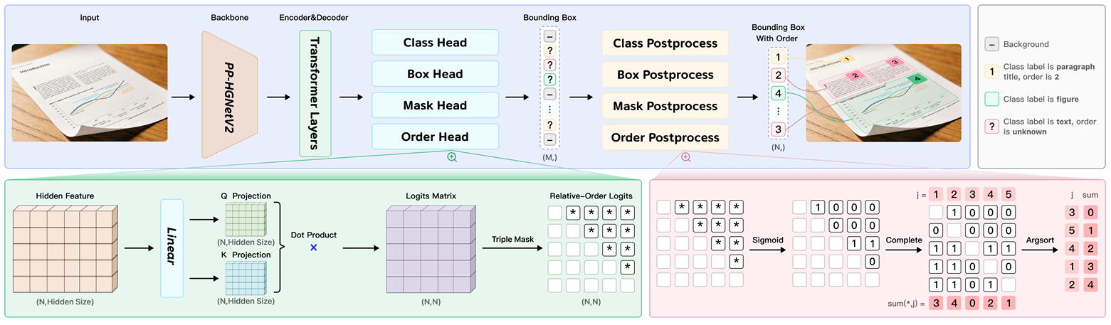 与PP-DocLayoutV2 [ 9 ] [9] [9]中使用的解耦指针网络不同,PP-DocLayoutV3将阅读顺序预测直接集成到Transformer解码器层中。通过将检测、分割和排序合并到一个单一的以视觉为中心的模型中,PP-DocLayoutV3消除了冗余的后处理和分离特征提取步骤的需求。