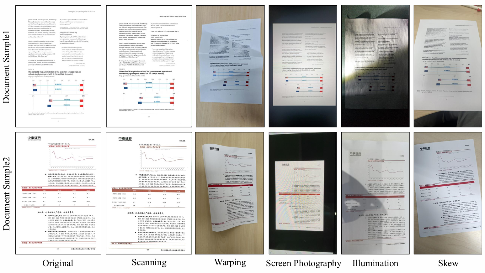 尽管取得了这些进展,一个关键差距仍然存在:大多数现有模型主要针对"数字原生"或干净扫描的文档进行优化。涉及极端物理畸变的真实场景------例如严重的倾斜、页面的非刚性弯曲、屏幕捕捉的摩尔纹以及不稳定的光照------仍然是重大障碍,即使是SOTA解决方案也尚未完全克服。
