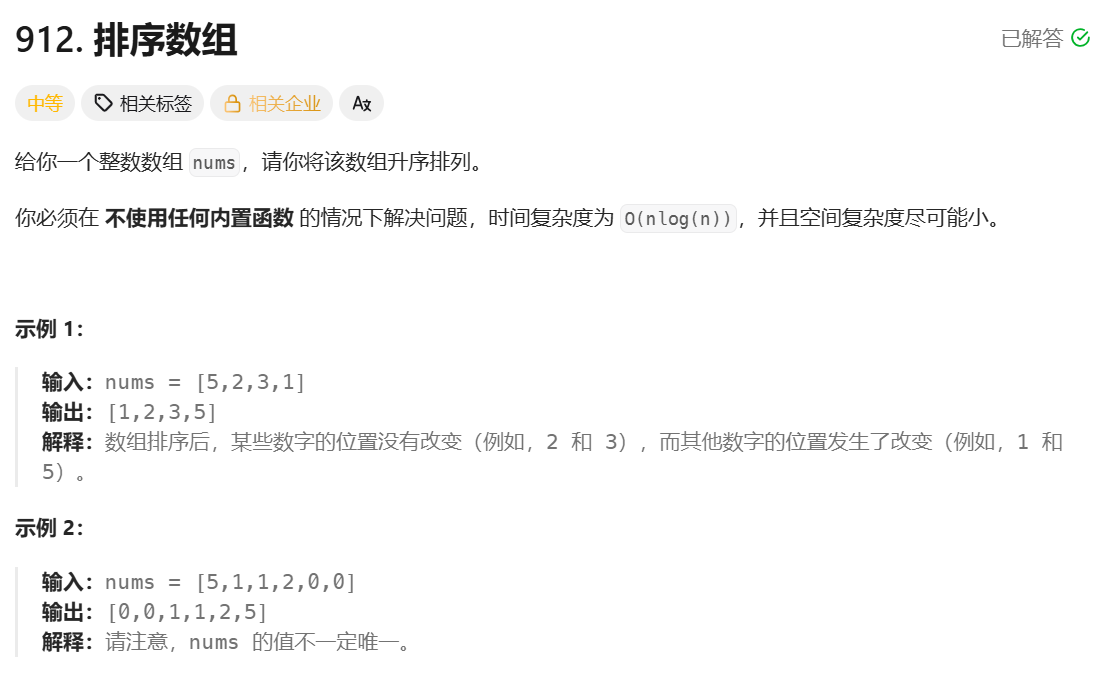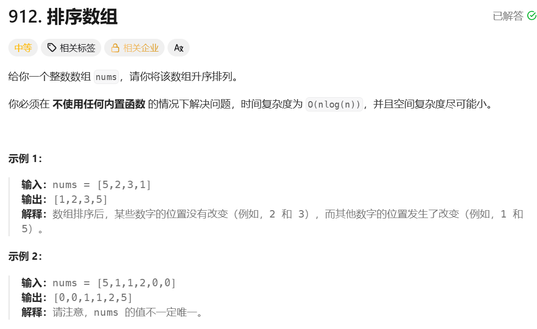 **思路:**这里使用归并排序的方法,计算数组中间下标,根据中间下标将数组分为左右两部分,分别将左右两部分排好序,然后左右部分进行合并,左右部分的排序只需要继续递归,不断将待排序区间分为左右两部分,直到待排序区间只有一个元素,此时无需排序了,递归结束,开始向上返回,返回过程中将排好序的左右两部分进行合并。