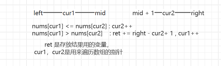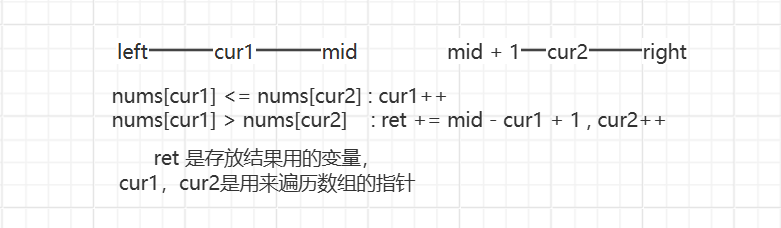 因为两边区间已经排好序了,所以当 nums[cur1] > nums[cur2] 时,nums[cur1] 后面的元素都大于 nums[cur2],所以[cur1 , mid] 这个区间(包含 cur1 和 mid)的数都能和 nums[cur2] 构成逆序对。