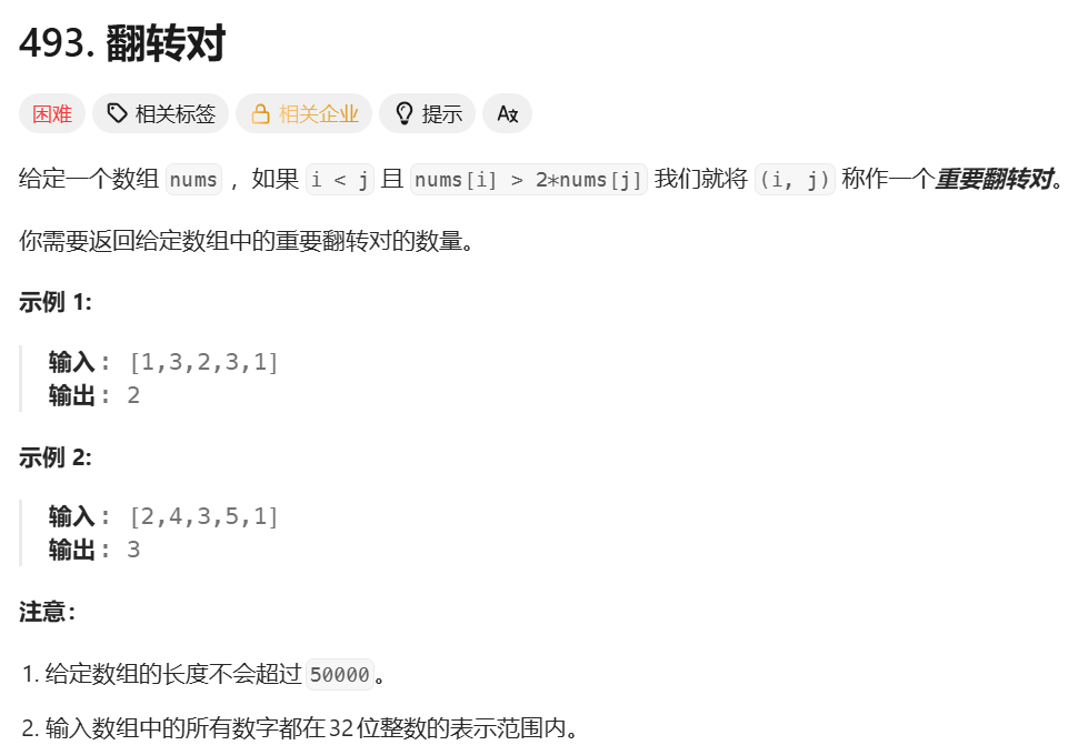 **思路:**这道题的思路和上面两题一样,就不在赘述了,不同的是这道题给出的比较关系是二倍的关系,而归并排序中合并有序数组时是直接比较的,不需要乘 2,所以此题计算有多少符合条件的翻转对是在左右区间排好序后,合并前单独进行一次循环来统计。具体参考如下代码(下面代码采用的是降序,升序也可以解决这道题)。