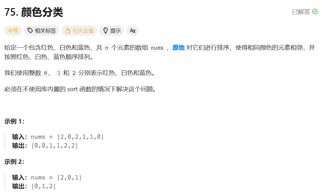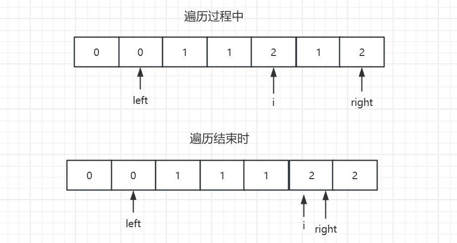 **思路:**定义三个指针 i,left,right。(三个指针在遍历过程中会将数组分为四块,但是遍历结束时会将数组分为三块,题目中三种颜色的划分正好需要将数组分为三块)