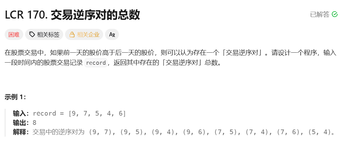 **思路:**这里使用归并排序的思想解决这道问题,找一个数组中的所有逆序对,我们可以根据数组的中间下标将数组分为左右两部分,分别找左边部分的逆序对,右边部分的逆序对,一左一右(即左右部分各出一个数)的逆序对,三种情况的逆序对数加起来就是最终结果。其中只在左边部分找逆序对的情况可以继续向下递归,分成左右部分,然后继续找左边部分的逆序对,右边部分的逆序对,一左一右的逆序对。右边部分同理,向下递归即可。所以最终其实就是在处理一左一右的情况。