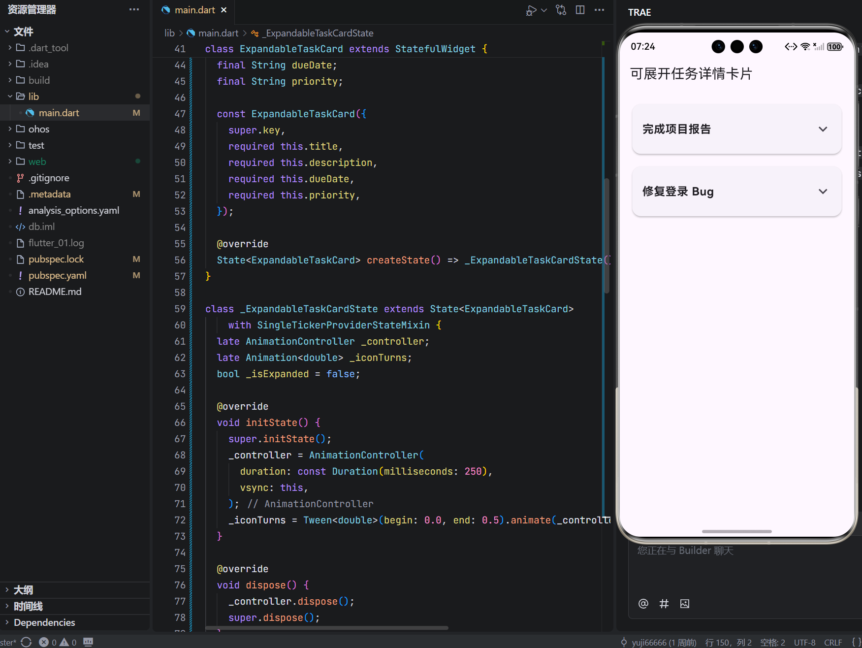 综上,该组件通过状态 + 动画控制器 + 过渡 Widget 的组合,实现了高性能、高反馈的可展开交互,是 Flutter 动画能力的典型应用。