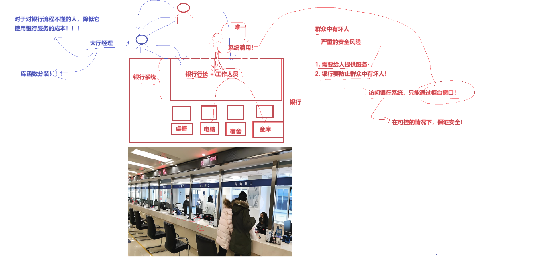 保障安全:绝对不能让客户直接进入金库或后台,因为存在坏人破坏、窃取资产的风险。