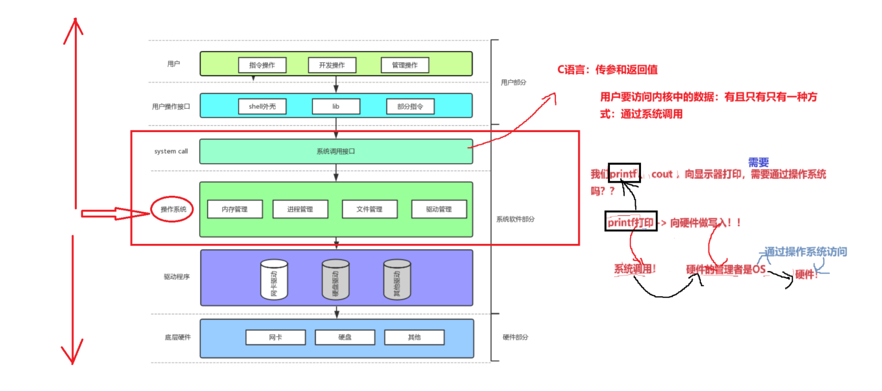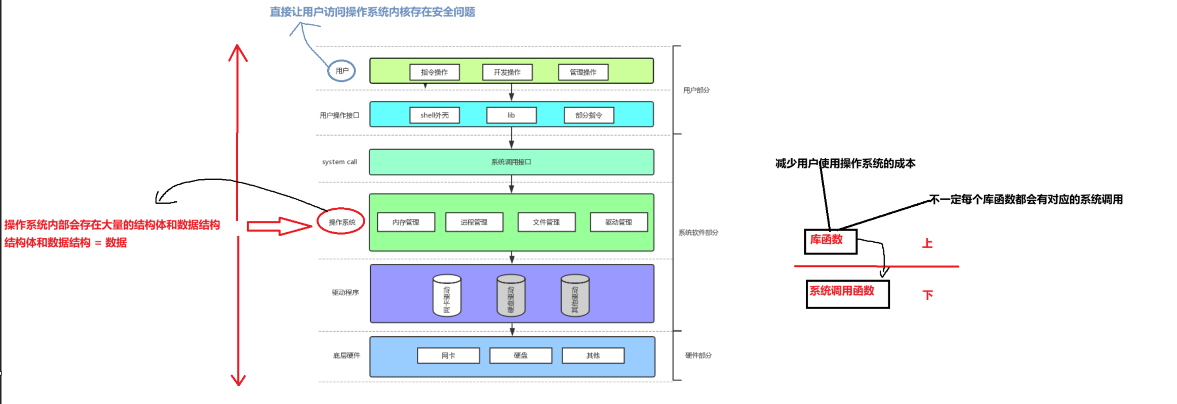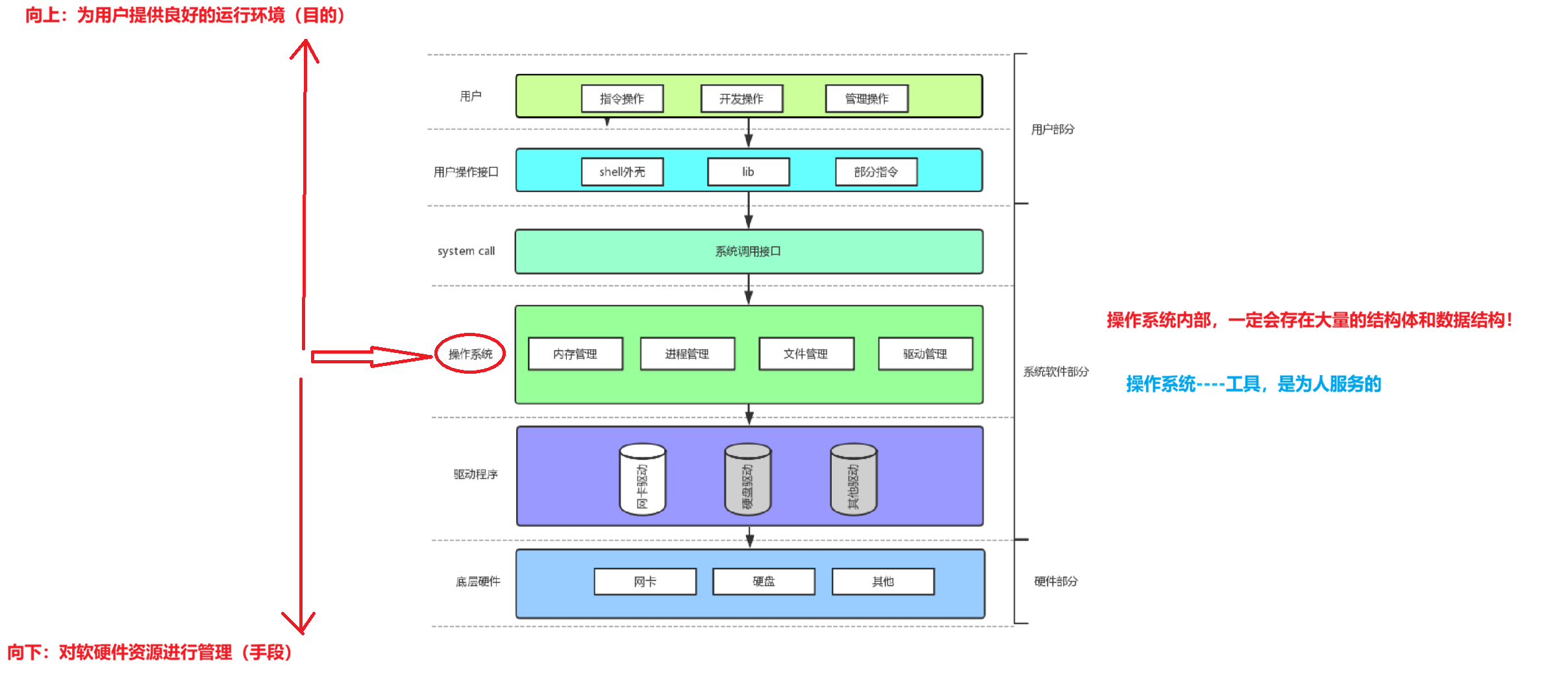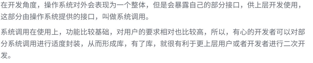 之前我们是从操作系统向下看,剖析它如何通过驱动程序管理底层硬件;现在转为向上看,讲解操作系统如何通过系统调用接口、用户操作接口,为用户提供安全可控的交互方式。