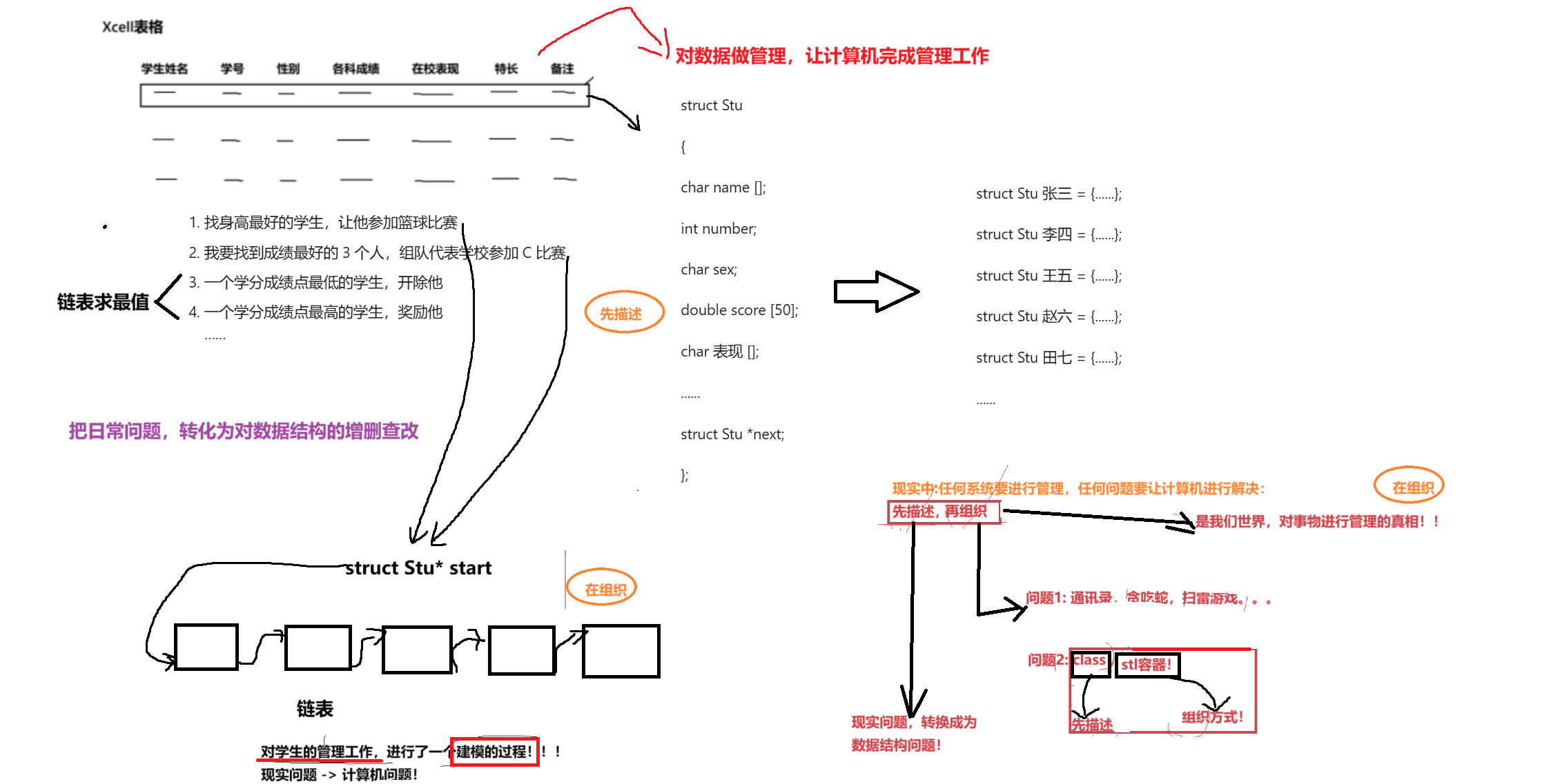 现实问题→计算机问题的转化原本用 Excel 表格做的人工管理工作,现在可以交给计算机完成。这一过程本质上是把现实中的管理问题,建模成对数据结构(比如链表)的增删查改操作,也就是先描述、再组织的过程。