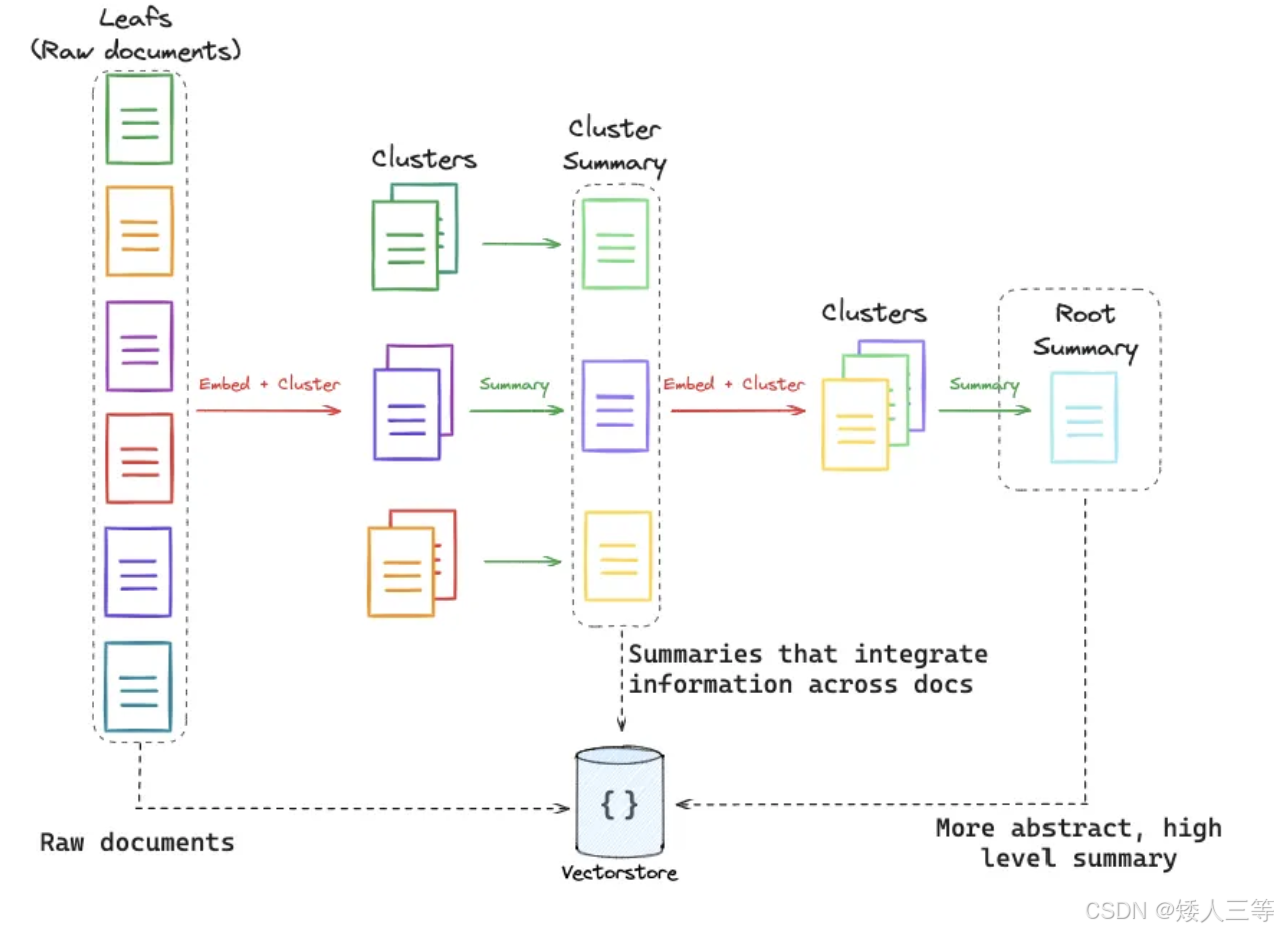 - 逐层递归抽象:对语义相关的叶节点做聚类分组,再用大语言模型为每个聚类生成摘要,这些摘要成为树的下一层 "分支";之后重复聚类与摘要步骤,对新生成的摘要再聚类、再总结。