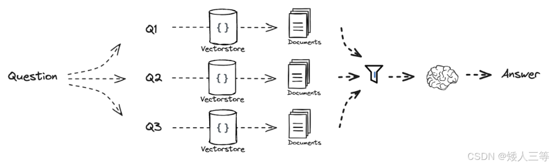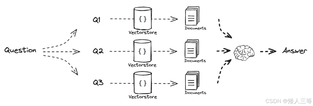 Multi-Query:在检索阶段针对同一个问题让 LLM生成多个不同表述的问题,通过这些问题分别去检索知识库得到不同的知识内容,后续可选:综合结果排序或者直接输入LLM,本方法侧重于"检索增强"