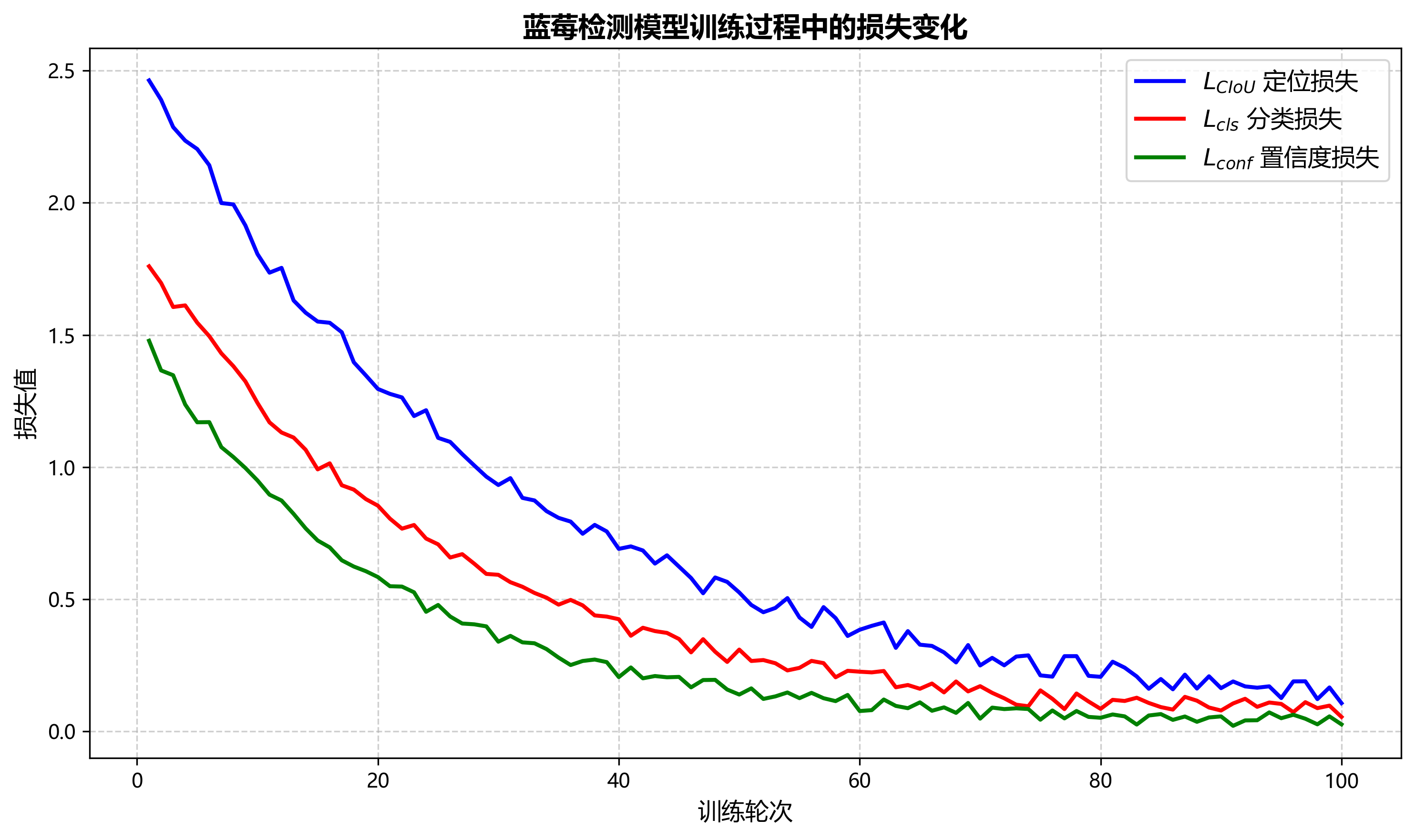 其中, L C I o U L_{CIoU} LCIoU为定位损失, L c l s L_{cls} Lcls为分类损失, L c o n f L_{conf} Lconf为置信度损失。通过这种方式,模型能够在训练过程中同时优化蓝莓的定位精度和分类准确性。