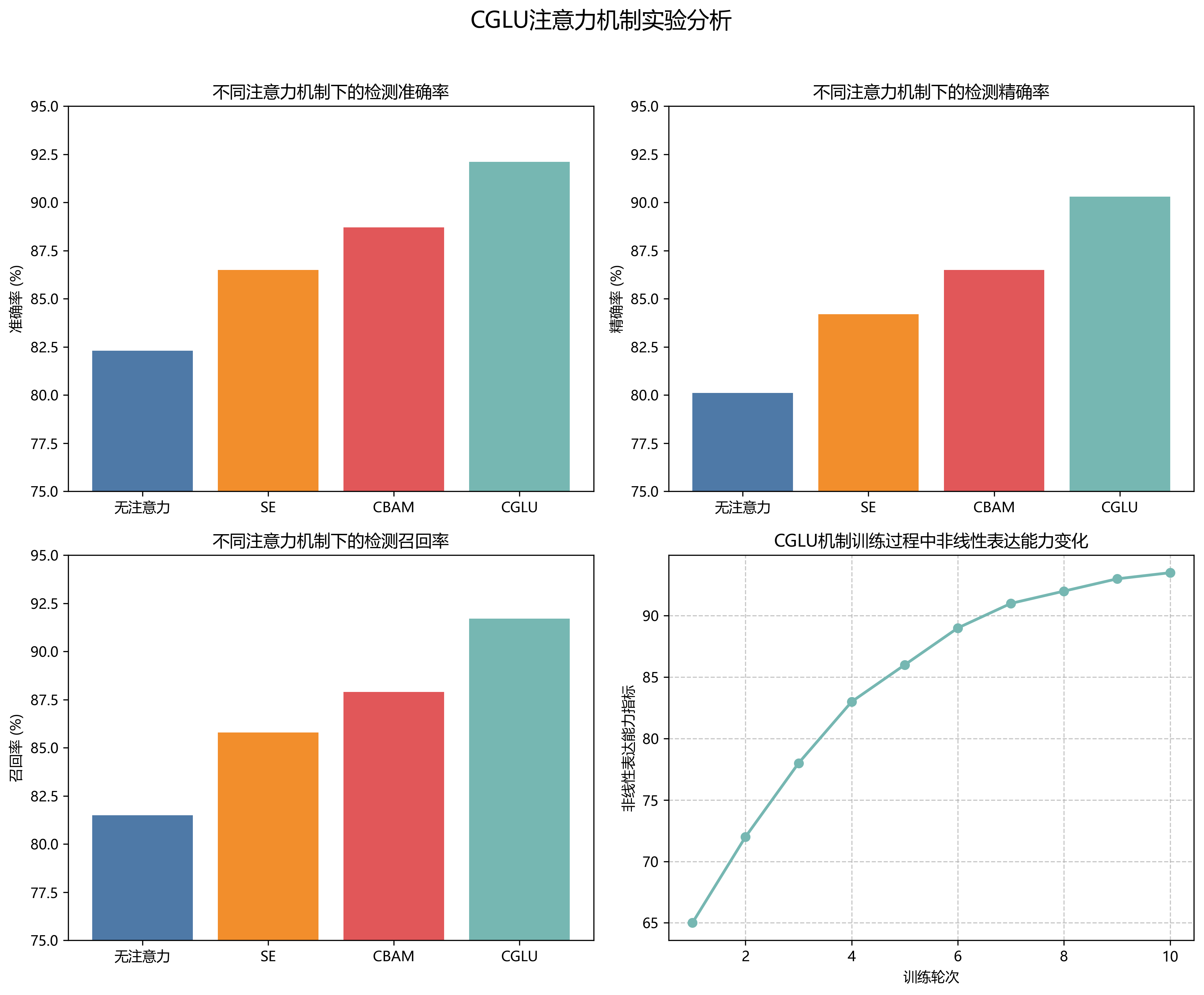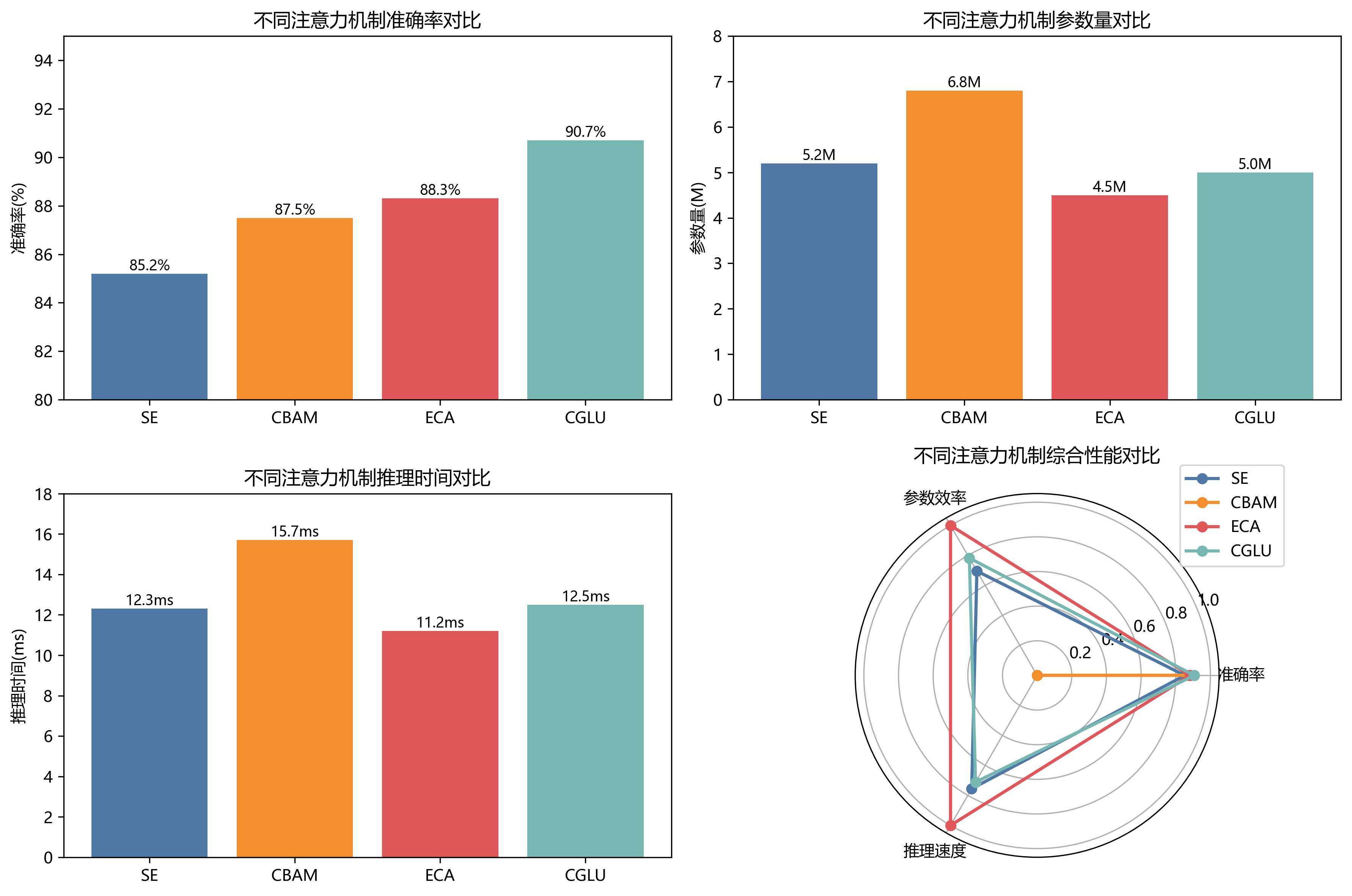 为进一步验证CGLU注意力机制的有效性,本研究将其与其他几种常见的注意力机制进行对比实验,包括SE(Squeeze-and-Excitation)、CBAM(Convolutional Block Attention Module)和ECA(Efficient Channel Attention)。实验结果如表2所示: