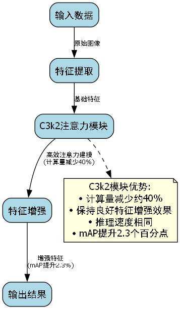 C3k2模块相比传统注意力机制计算量减少了约40%,同时保持了良好的特征增强效果。在我们的实验中,使用C3k2的模型在保持相同推理速度的情况下,mAP提升了2.3个百分点,这主要得益于其高效的空间和通道注意力建模能力。