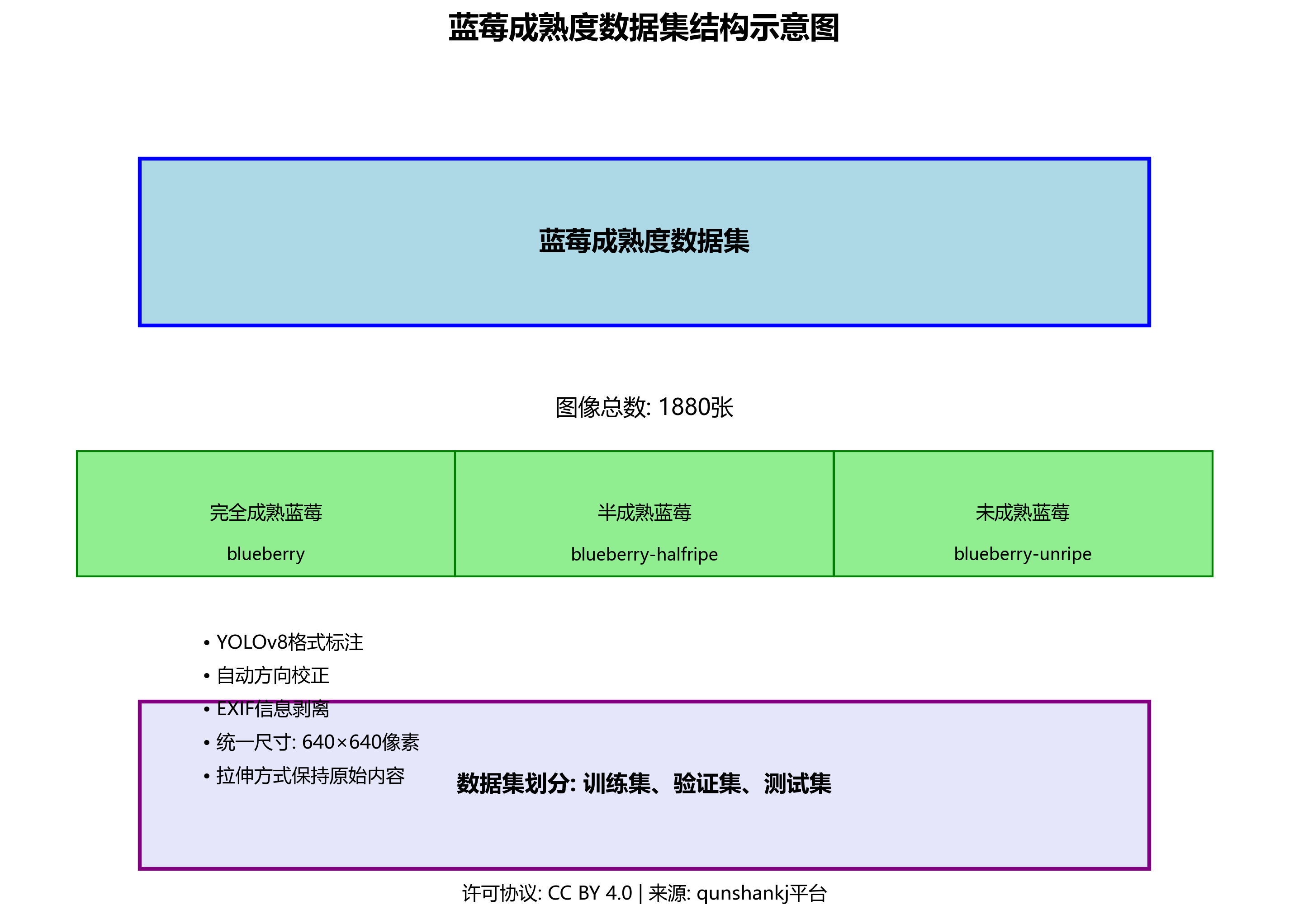 蓝莓成熟度检测模型的训练需要一个高质量、多样化的数据集。本研究构建了一个包含3000张蓝莓图像的数据集,涵盖不同光照条件、背景复杂度和拍摄角度。数据集中的蓝莓被分为三个成熟度类别:成熟(深蓝色)、半成熟(浅蓝色)和未成熟(绿色)。