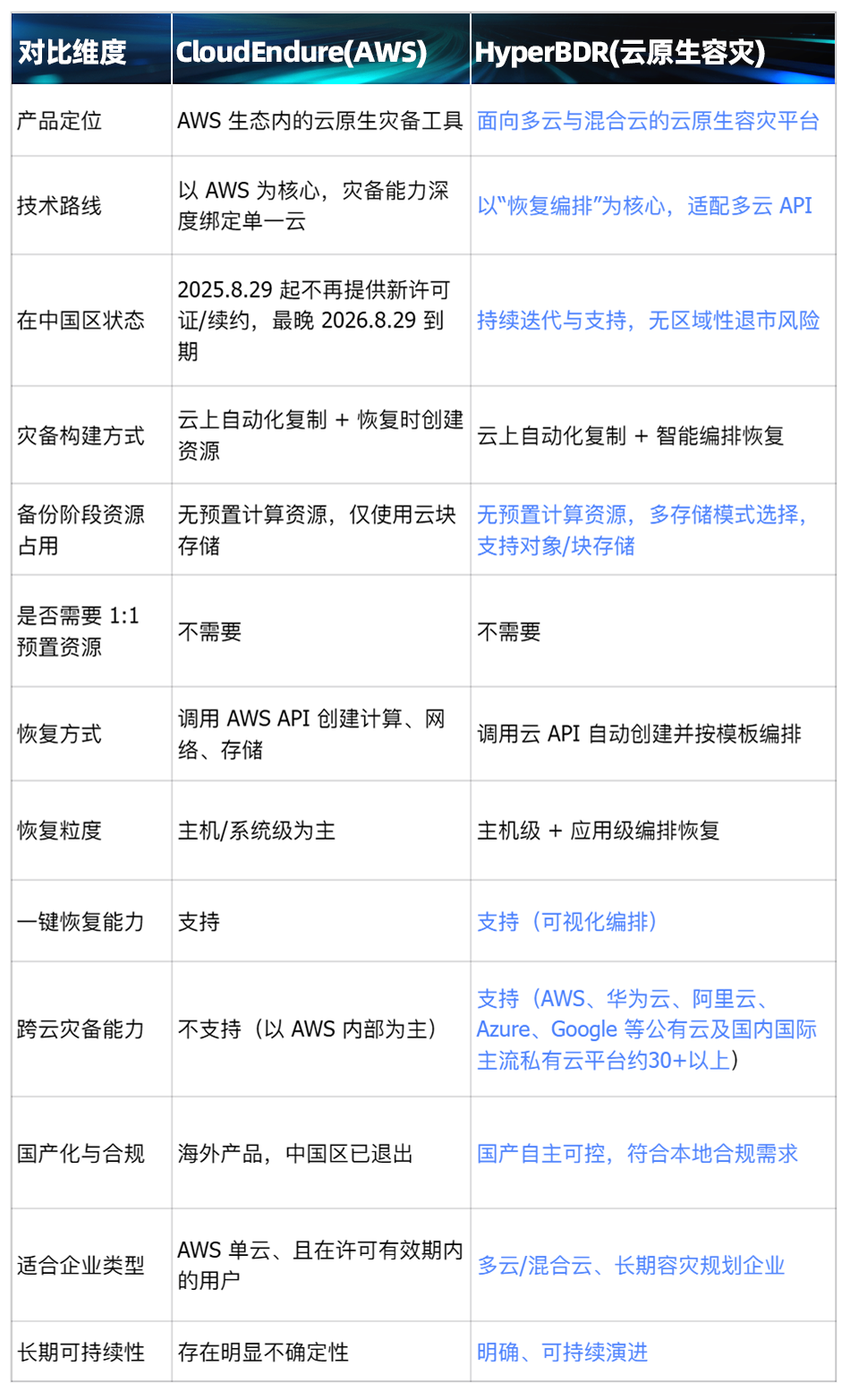 CloudEndure 的宿命,很大程度上来自于"绑定单一云生态"。而 HyperBDR 走的是另一条路。