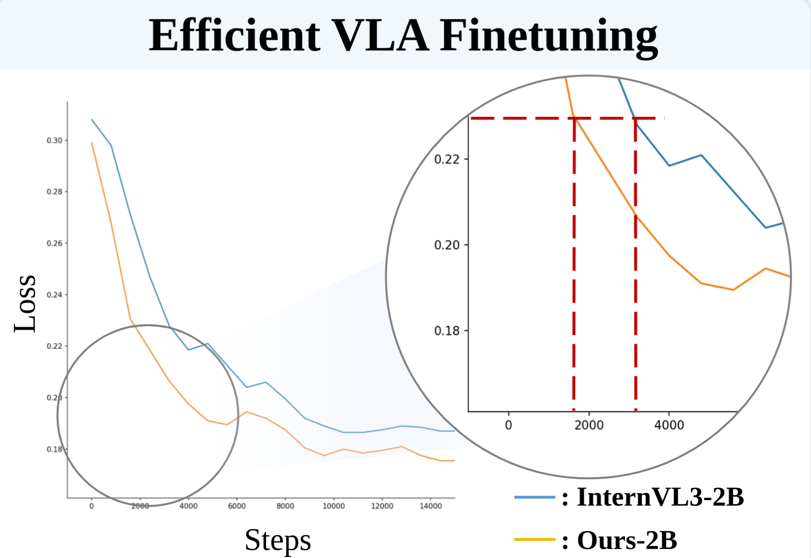 | VLM 骨干 | InternVL3(2B/8B 参数) InternViT 视觉编码器 + Qwen2.5 LLM | 提供感知、语言理解与具身推理能力 |