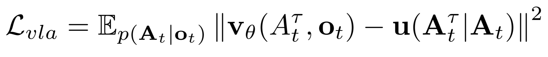 其中At τ为噪声动作(τ为流匹配时序),u为目标去噪向量场。